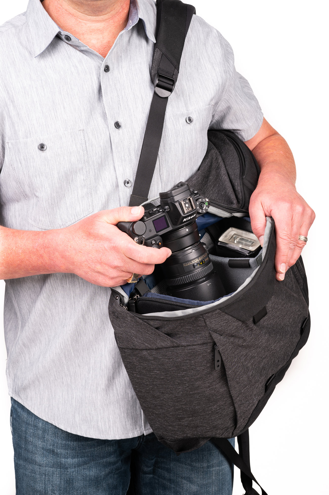 The spacious top compartment features a magnetic lid that is easy to open with one hand, yet closes securely with just a quick flip. Inside the top compartment, zippered pockets keep your essential items secure and organized, including a 16-inch laptop and 10-inch tablet, or documents. A large, bottom compartment offers front and side access enabling you to reach bulky items like a jacket or camera cube insert (sold separately) without taking off the backpack. A convertible divider between the top and lower compartments create one large continuous space.